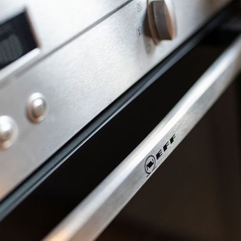 Fully equipped German kitchen with electric induction hob, oven, microwave, integrated dishwasher and washing machine.